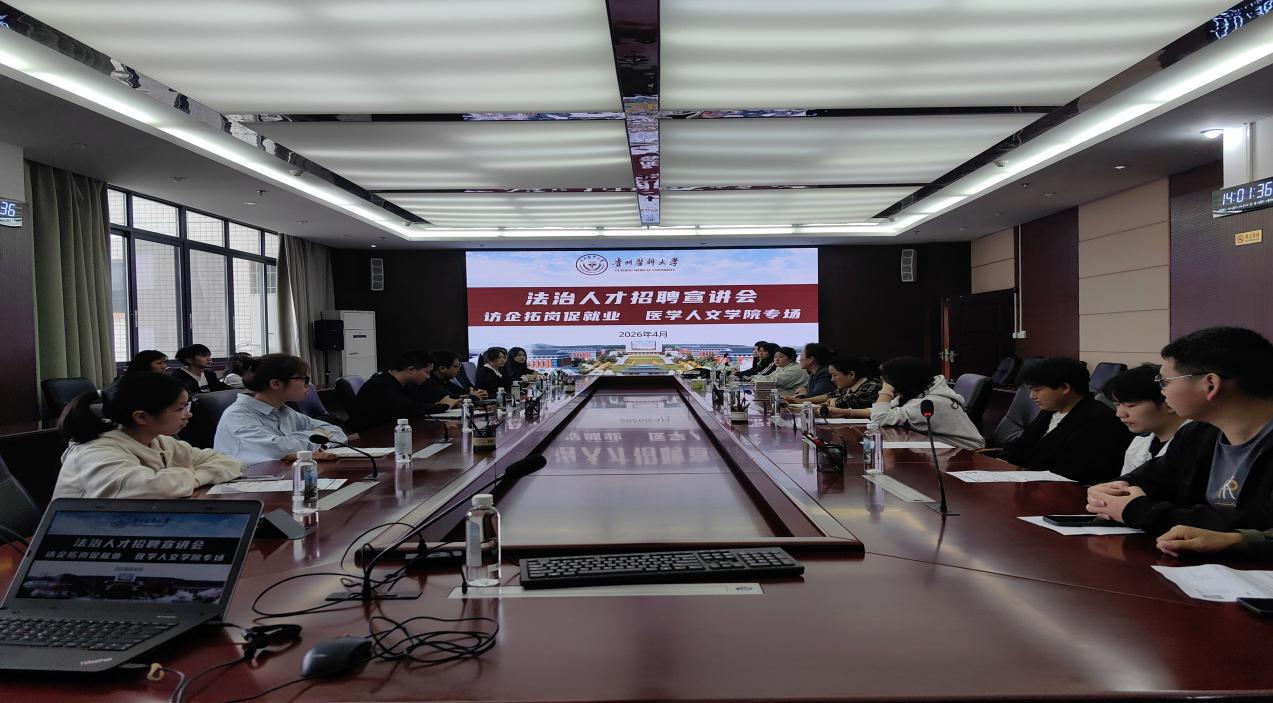 召开法治人才专场招聘宣讲会。贵阳市法学会法学教育研究会副会长、贵州骁远教育科技有限公司总经理(厚大法考贵州分校)王鹏鹏,公司人事总监邓智超应邀到校开展宣讲。学院党委副书记马琳娜、团委书记马曾珍、毕业班辅导员及2026届毕业生参加本次活动。